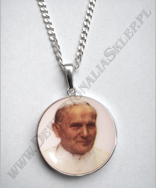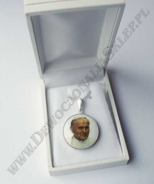 Medalion porcelanowy dwustronny o średnicy 22 mm ze srebrnym łańcuszkiem 50 cm (2,5 g) w eleganckim białym pudełku.